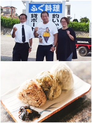 あけぼの旅館に来るお客さまは釣りファンも多い。前泊して朝の4時から船に乗り、海に浮ぶいかだの上で夕方までアジやキスを釣りあげる。帰ってからはゆっくりふぐに舌鼓。最近は釣りガールも増えたそうで、愛知や名古屋、大阪からも本格装備で釣果を狙うプロ顔負けの女性たちがやってくるそう。釣り客のお昼ご飯にもおむすびを持たせてくれる。
