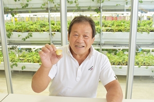 前田光樹さんはバイオテクノロジーのプロフェッショナル。日本で初めてビニールハウス内で、夏に一季成イチゴ(冬イチゴ)を生産する事に成功した。