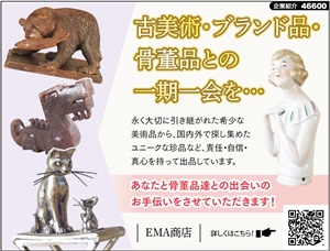 長い時代、その姿をとどめてきた古美術品やアンティーク品は千人に声をかけて、ひとりが購入するような世界。しかし、そのひとりにとっては特別な宝物となるのだ。EMA商店の取り扱いは幅広く中国や日本の陶磁器から、西洋の古道具、仏像、茶器、木製品、置物まで。時代も石器時代から中世、江戸、明治までを幅広く網羅する。