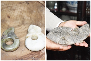 丸尾 これは『勾玉』と呼ばれるもので古代人は幸運を願ったり、生命の原点として崇拝の対象とされていました。永く土に埋まっていたので沈んだ色になっており、特に石の詳しい年代など私は長い間研究しています。この双龍の玉石は中国古美術の権威が今年の年賀状写真で使った逸品です。