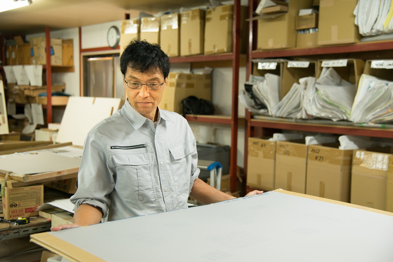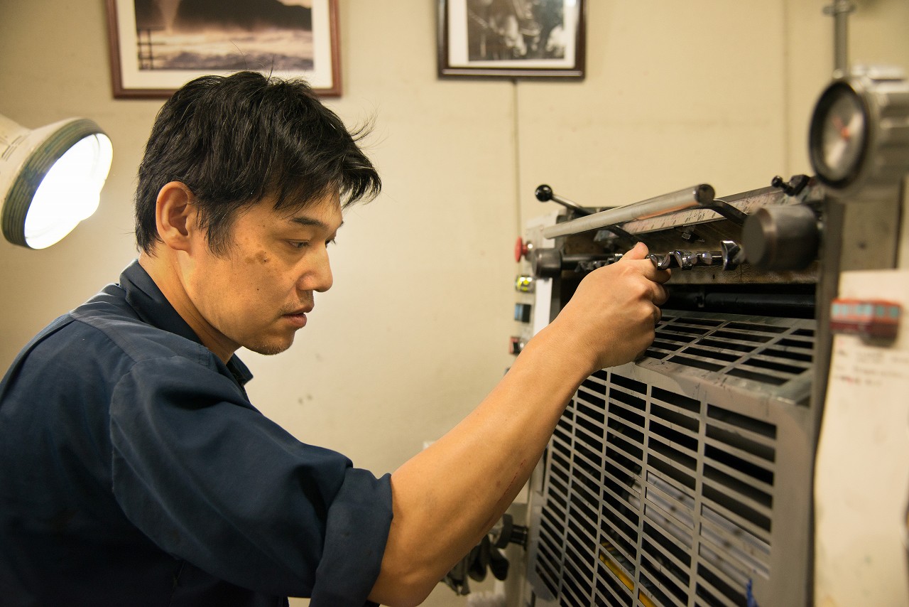 仕上がった印刷物を車の荷台に積み、納品に向かったかと思えば、一方で電話が鳴って急ぎの案件が舞い込む。前日に三階の製版室で入念に仕上げられた刷版は一階にある大型の菊全四色・二色の両面機がフル稼働して次々と刷り上げる。この道二十五年の林さんが操作盤を睨んでいる。ここで働く人は熟練の印刷工ばかり、機械を扱うだけなら二年ほどあれば覚えられるというが、そこから先が終わりのない技の世界だという。「日本の印刷工は汚くて地味、給料お安いってイメージだけど世界一の腕を持っていると思うよ。技術もさることながら、丁寧な仕事をするからね」。最近、海外から安い紙が持ち込まれることもあるが、自社では注文しない。安さだけがすべてではない、お客さまの求めるクオリティーを越えていくことを目指している。