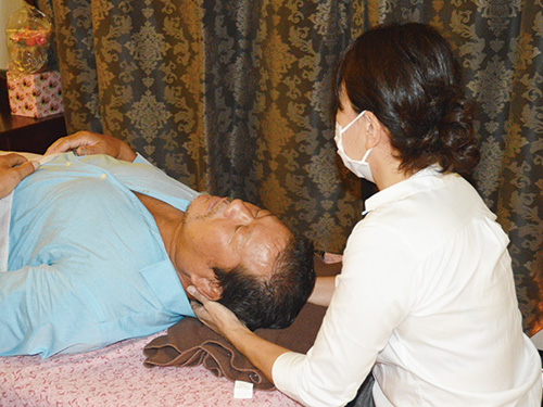 家族のため、会社のために頑張るお父さん・お母さんを癒すおうちサロン「ひよりーな」。「こんなええお日和に、なにそんな疲れた顔してるん? うちに来−な、ほんで元気出しーな!」と元気なかけ声。カラダの状態を確認しながら足先からほぐし、首・頭をじっくりマッサージしてくれる。