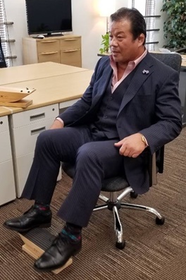 「世界にここだけの、座りながら、歩けるツールです。90歳のおばあちゃんが5分で1、000歩を歩いている計算で運動できます。」