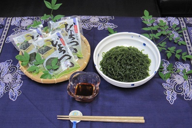 中村 新鮮なわかめの葉をまるごと原料としたわかめ麺『ひょっつる』です。新しい感覚でわかめをたっぷり召し上がっていただけます。
