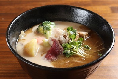 メニューを見てびっくり!「味噌シチューラーメン(850円)」。注文すると、濃厚なシチューと味噌がびっくりの融合。スープには、ニンジン・玉ねぎ・ブロッコリーと野菜がゴロゴロ。やわらか〜いローストビーフは和洋合わさったまろやかな味わい。
