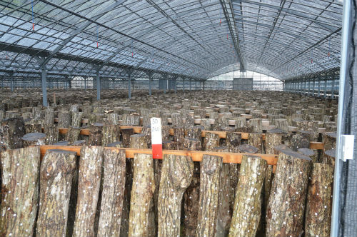 木村 遮光ネットを取り付け木漏れ日を再現しています。当社は、肥料や農薬を⼀切使わず、地元対馬の湧⽔により、自然の山に近い環境で育てています。原木に種付けをして、約1年半ぐらいで収穫できます。