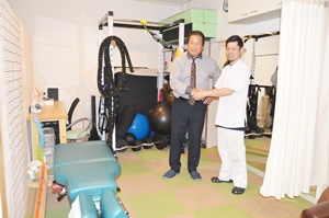 院内には加圧機器も充実。「私は身体全般に興味があります。鍛えるのが好きなこともあり、院内にトレーニング機器を整備。施術で元気になったら、それを維持するための運動をお勧めしています」と爽やかな笑顔の川節院長。