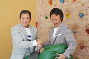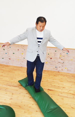 藤原 子供の為の体幹トレーニングなど、まずは体の土台を作ることを基本としています。また、宮崎県は自然が豊富なので山や川・海などでも活動をしています。一方、オリジナルの運動補助器具も工夫してきました。例えばこれはビーズクッションを改良し、屋内に砂浜を再現。足の裏や指を刺激し体幹を鍛える道具です。これは三点倒立を補助するツール。これらは、商品として全国に販売します。