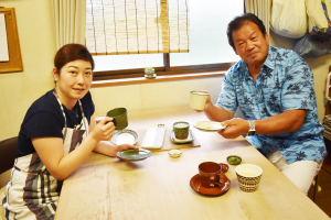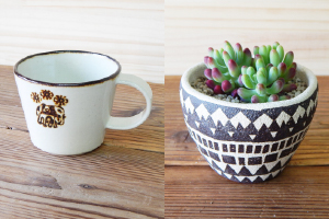 信楽の土を取り寄せて、陶芸家の安井さんがひとつひとつ手作りするお皿やカップ。優しい手触りでなんだかぽかぽかあたたかい。安井さんが好んで使うという、民族文様がアクセントだ。