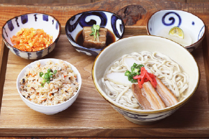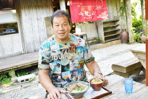 御殿山と書いて「うどぅんやま」。純麺か胚芽麺か選べるつるつる、もちもちの『沖縄そば』が絶品だ。料理長が毎朝とるかつお出汁のスープは最後の一滴まで啜りたいほどのおいしさ。途中で島唐辛子を入れると、味が変化して二度おいしい。トッピングの『軟骨ソーキ』も味がしみて、いい旨味が出ている。