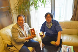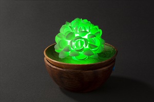 不思議な形の貝殻が、ランプになりました。深い海の青緑から白色へ、白色から紅色に優しく変化します。ほのめく光に見入っていると、まるで沈黙を守る貝と一体化するよう。このランプを作ったのは省力機器や精密検査装置の開発設計歴、約30年の鈴木さん。