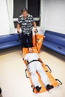 「人が出入りする施設などに常備していただく担架です。力の弱い方でも負傷者を引きずって運べるように工夫のあるグッズで、さっと持ってきて、ぱっと広げて使えるから便利です。バックルで固定した後、紐を引っ張るだけのはじめてでも分かりやすい構造も利点です」。