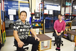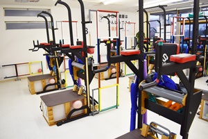 愛知県豊田市にある二階建ての空間・メディカルフィットネス『プレゼンツ』。「まずは足の裏を使って、左右の足を交互に操作する訓練です。このようにしっかりと踏み込むと小脳が活発に働きます」。見慣れぬ器具の間に立ち、身体の仕組みについて解説しながら指導するのは、オーナーの鳥生さん。一階はトレーナーが指導する教室、二階は自主トレスペースになっている。