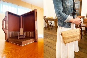 『家具鞄®KAGUKA®』はカバンと家具、両方の機能を持っているもの。触ってみると優しい木のぬくもりになんだかホッとする。井上さんによると、昔のカバンは木製だったそう。伝統が現代的なデザインでよみがえり、まるでタイムスリップしたような不思議な気分。斬新な最新意匠を同時に味わえる。使い方はあなた次第!価格は10万円程度からお求めいただけます。