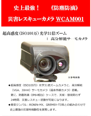 橋本 当社はカメラ機器を開発するベンチャー企業です。社名のD-eyesのDはドラゴンのD=B今回、ドローンに搭載する災害用レスキューカメラ『WCAM001』を発表したのですが、社名に天から龍の目のように鋭く見る≠ニいう意味を込めました。『WCAM001』は防塵防滴。超高感度・光学31倍ズームを搭載し、さらに高分解能サーモグラフィーが付いています。災害時はまさに空から鋭い目で被災者を探すことで、命を救います。