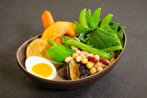 JR帯広駅より徒歩3分の好立地にある『夜のスープカレー屋さん』は、早朝4時まで営業しているとあって夜の宅配や二軒目のお客様で大忙し。スープは20種類のスパイスを使ったクセになる味。オーナーが通い詰めた札幌のスープカレー店店主直伝の味で、次の日も胃にもたれないさらりとした旨さ。かぼちゃやいんげんなど十勝の野菜や、ジューシーチキンなどボリューム感のある選べる19種類のトッピングが豪華。