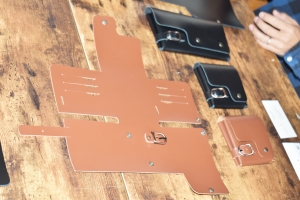 まるで折り紙ならぬ折り革!?一枚革をパタパタと畳むと、あら不思議。わずか15分でオシャレな財布が完成する。自分で作ると、愛着もひとしお。この製品は財布にエピソードを持たせた『ウォレッツストーリー』。現在注文待ちの人気商品だ。