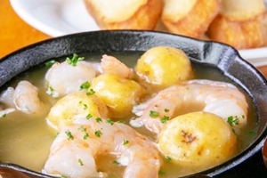 『小エビたっぷりのアヒージョ』はアンチョビとニンニクの効いたオイルに、エビがゴロゴロ入った逸品。旨味たっぷりのオイルを食べ尽くそうと、皆さんがバゲットを注文する。