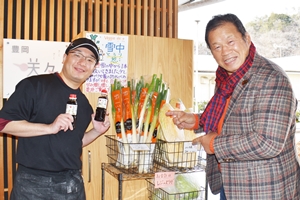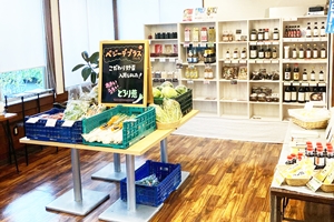 『咲々マーケット』は、「豊岡咲々うどん(以下咲々)」隣接の小さな販売店。四季折々の豊岡野菜や調味料が並んでおり、地域の企業がコラボした加工品など、地域愛あふれる商品が購入できる。おススメは咲々が有限会社花房商店とコラボした『花咲おだし』。通常、めんつゆはお湯で希釈すると味が薄くなってしまうが、うどん屋らしい発想で、お湯で11倍に希釈したときが一番おいしいおダシを完成させた。また、「Veggie de+」をはじめとする地元農家が手塩にかけた素材が季節に合わせて並び、山田さんがその時々に合わせたコラボメニューを考案、咲々で味わえる。豊岡在住なら要チェックです!