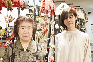 「芸術学博士」で、日本を代表するちりめん細工の作家である。古布江戸ちりめん他、明治〜昭和の時代布を使い、人形の着物や吊るし飾りを制作する。今や稀少価値の高い布の在庫は反物にして2,000反に及ぶ。 |