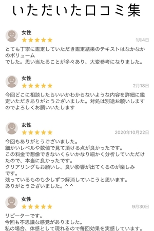 対面と名前鑑定を使いながら光の皇さんの施術を受け、身体を楽にしていただきました。厄も見ていただいたのですが、通常より少し多めの47個憑いているようです。私も定期的にキレイにしたいですし、セルフの浄霊にも興味があります。