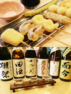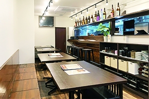 ランチメニューは、素材にこだわる『もつ鍋定食』が人気。夜は、名物のもつ鍋、焼き鳥、薄い衣で揚げた串揚げなどが入った居酒屋コースが定番。ディナーは常に満席だ。