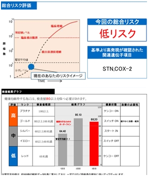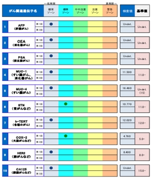 福沢 『臨床ゲノム医療学会』との連携により実現したシステムです。血液採取により『長寿遺伝子(サーチュイン遺伝子)』と『がん関連遺伝子』の値を数値化し、食道・肺・肝臓などアジア人に多発する男性8臓器・女性11臓器から、各がんリスクを5段階で評価します。
