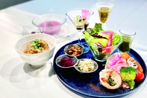 まずはホウレンソウとバナナのスムージーが登場。最初にスムージーを飲むのは栄養を吸収しやすくするためで、理論に基づいた提供順位でもある。栄養価や生産環境など食材へのこだわりはもちろん、調理法から最新食材まであらゆる角度で研究しているのだ。紅くるり大根のポタージュは美しい逸品。〆は米粉のワッフルで、罪悪感なくスイーツを味わえる。