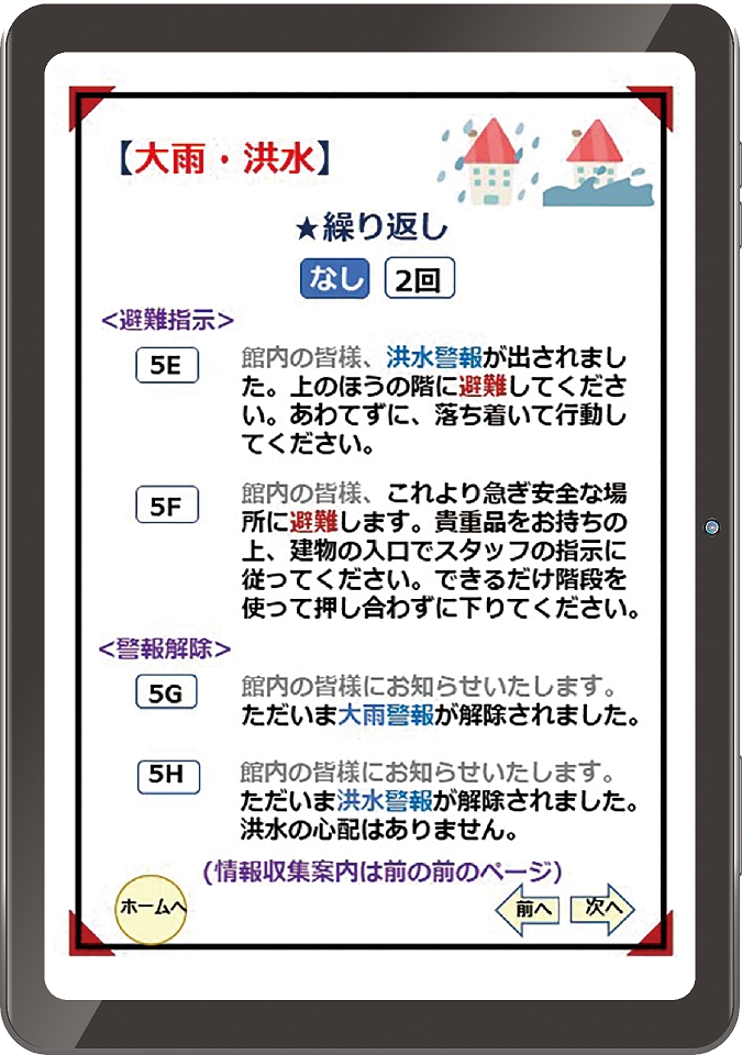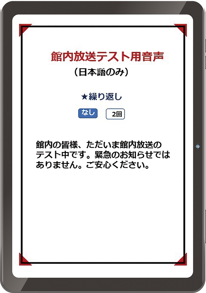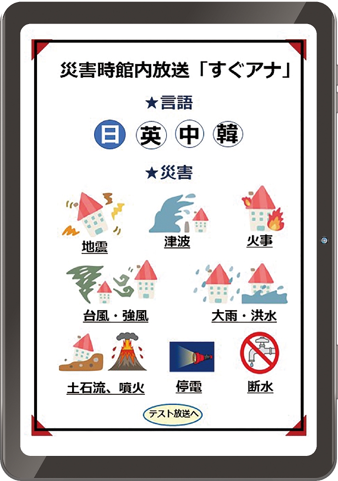タブレットで使える館内放送アプリ『すぐアナ(29、800円(税込)』は、放送機器にタブレットを繋ぐだけ。「館内の皆さま、これより急ぎ避難を開始します。エレベーターは使えません」といった緊急アナウンスを日本語・英語・中国語・韓国語の4言語で放送。地震や大雨の他、火災など災害時に必要な約60種類の文例が収録される。
