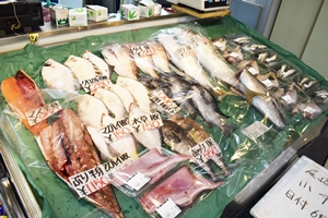名物の『たつかま』は11〜2月がシーズン。取材時は代わりに大きなウニをいただきました!ヤマシメイチ尾崎商店の名物で、海洋深層水で育ったムラサキウニ。料理屋でいただくと4〜5千円する高級品です。他にも陳列棚には大きなタコや魚がたくさん。ここで買うと安くておいしいよ!