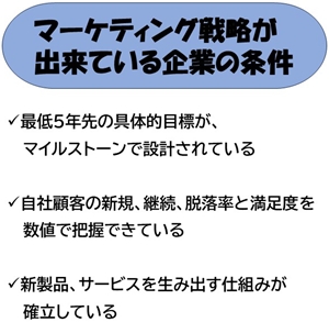 市場調査の他に、自社の長所と短所を整理し、顧客とマッチするポイントを探す「個々の戦略」も重要だ。中小企業の経営者の6割は、戦略戦術策について困っているとのデータがあり、その約2割しか他者に相談しない。マーケにも修正できる限界があるので、病気と同じく、資金繰りに困ってからでは手遅れ。早めに相談しよう。