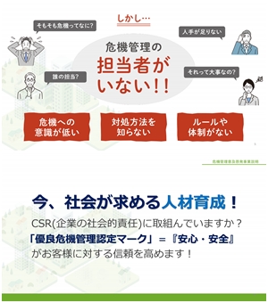 本間 まずは、国際危機管理機構による、代理店の育成トレーナーの養成。次に、代理店トレーナーによる危機管理診断士を育成していきます。その研修がスタートしており、制度についてはメディア広報にも力を入れ、浸透させています。