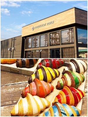 糀谷 当店、コクリコルージュには約200種類のパンが並んでいます。一番人気は色とりどりのクロワッサン類。クリームなどの具材が入ったものもあります。最高級のバターを使用。1日に1500個は出る人気の商品です。子どもの頃、ケーキ屋さんに行くとショーケースの中は色とりどり。楽しかった思い出を大切に、パン屋の棚に再現しています。