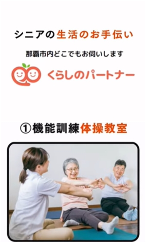 介護やリハビリなどの豊富な経験で、健康・生活面をサポートする『くらしのパートナー那覇店』の伊是名さん。買い物代行や電球交換、お掃除などはもちろん、本格的な出張ソフト整体や高齢者向けの体操教室など、沖縄の高齢者の方々にとって、今やなくてはならない暮らしのパートナーだ。柔道整復師・スポーツトレーナー・医薬品登録販売者などの資格に裏付けされた知識や技術と、TVやラジオなどでタレントとしても活躍する親しみやすいキャラクターも愛される理由。「誰かの役に立つのが好き」と語る伊是名さんが、沖縄での暮らしに健康と笑顔を届けていく。