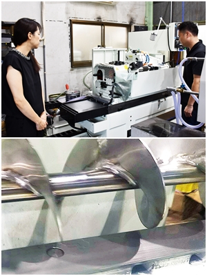 工場内の新しい機械類を見学。今年に購入した機械の他、先日導入されたばかりの内径を研磨する機械も。ゴトー研磨では、特に精度が要求されるため、先端機器への関心は高い。価格にして1000万円以上かかるものは当たり前。最も高額なもので、2000万円以上の大型機器も。ピカピカの機械を設置すると、一般のお客さまの目も変わる。