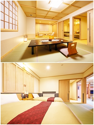 歴史ある旅館だが、定期的な改装によりメンテナンスされており、清潔感とデザイン性がある。エントランスには秋田の名品である『こけし』がずらりとお出迎え。部屋に入ると窓から四季折々の景色が広がるなど、目を和ます風景があちこちに。新館はユニバーサルデザインとなっており、フラット空間のため、ご高齢のご家族やご夫婦も安心して過ごせそうだ。