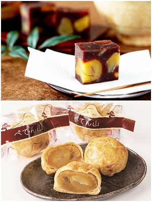 店頭にはシーズンごとに、季節にちなんだ和菓子が並ぶ。10月初旬から12月末までの限定商品で、店を代表する和菓子は、栗蒸し羊羹『みつ栗の月明かり』。日本一の栗生産量を誇る茨城県笠間から新栗を仕入れて作る逸品で、農家でひとつひとつ手作業で剥かれるのが特徴。栗は3日間、濃度の濃い蜜に漬けこまれており、濃厚な栗の味とねっとりとした食感が堪能できる。