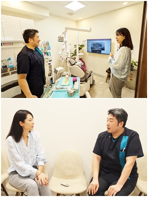 院長は、メタルの詰め物をなくす『メタルフリー』の治療なども実践。歯科治療には保険診療と保険診療外の領域があるが、例えば歯の5番目までは保険内で治療し、奥歯はセラミックにするなどの選択も提示しながら、それぞれのプランをしっかり検討できるように説明を重ねる。また、事前に精密検査(1万5千円)を受けることで、自分の口内全体を細かく把握できる。