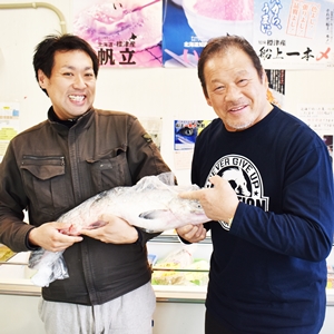 北海道の最東端、おいしい海産物が獲れる根室海峡の標津町にある海産物店『魚柴』。「朝どれの新鮮な海産物ならお任せください。セリに行き、飲食店を中心にご要望いただいたものをお届けします。店頭には名産の活ホタテをはじめ、ここで加工したいくら、食べやすくカットした新巻鮭などを並べています」と柴田代表。 |