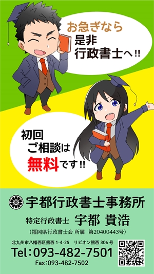 飲食店、建設業、バス事業など、新しく事業を始める際に必須な、国や都道府県への許認可申請。幅広い申請、届出の際に力になってくれるのが行政書士。福岡県を拠点にこれらのお手伝いをしてくれる『宇都行政書士事務所』。理系大学で化学を専攻したのちに観光業でバス事業に携わる中、申請業務で関わった行政書士という仕事に興味を持ったことから転身、事務所開設までに至った宇都貴浩先生。幅広い事業についての許認可申請はもちろん、PCB廃棄物に関わる申請や、ドローンの飛行許可申請、スクールの紹介まで対応。今後は融資や補助金など、企業の運営に関わるトータルサポートも目指す、心強いパートナーだ。