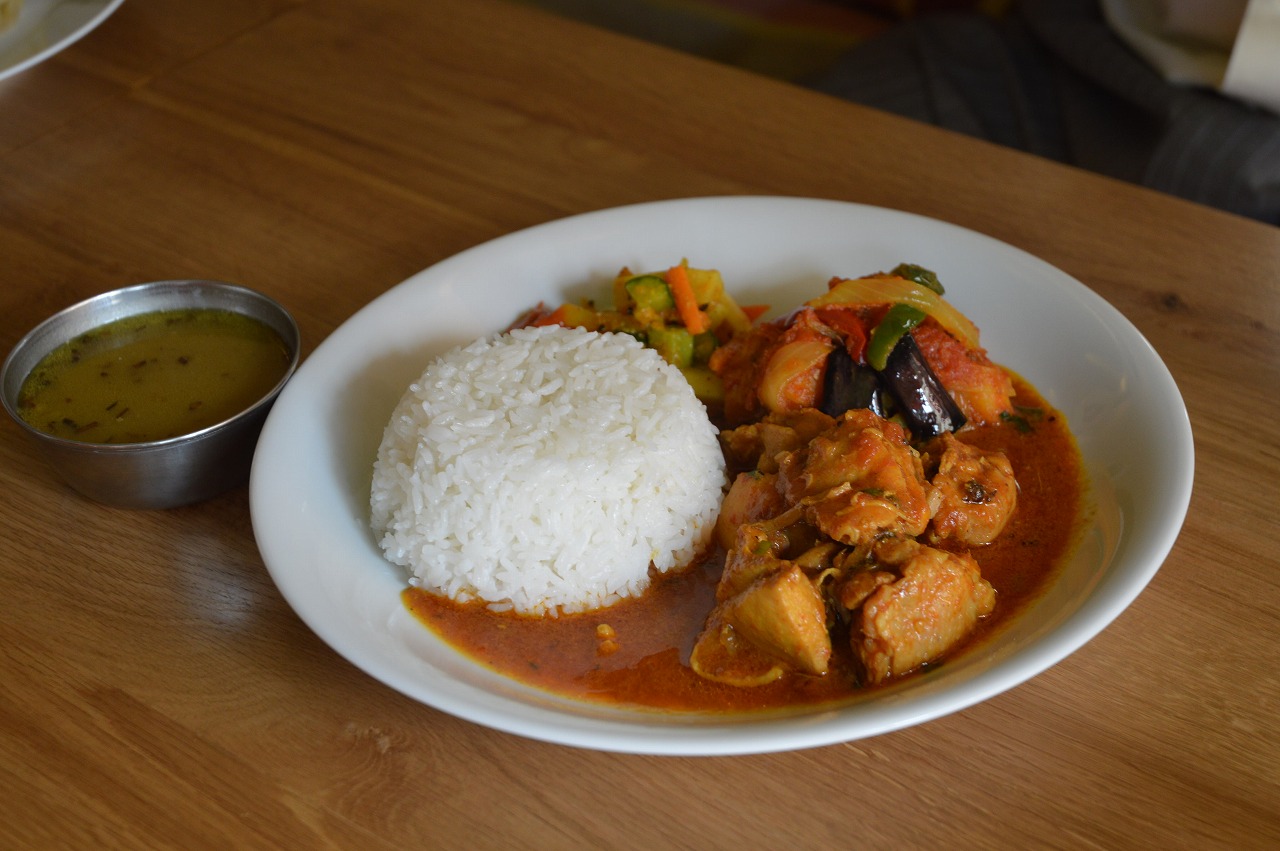 試食させていただいたのは、人気メニューの「ダルバート」と「モモ」。「ダルバート」は、ネパール風カレー定食といった感じ。ワンプレートに、ご飯、おかず的なカレー、ネパール風漬物がのっている、また、お味噌汁かわりに豆のスープがついてくる。「モモ」はネパール式蒸し餃子。