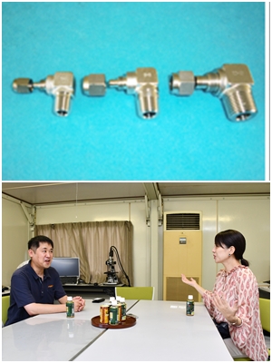 河野 当社は、半導体や船の部品に使われる『ステンレス継ぎ手』を中心とする製品について、最新機械によるオンリーワンの加工にこだわっています。加工前に磨きの工程を挟むという全国でも珍しい手法と、加工後に光沢液で艶を出す仕上げで、実用性だけでなく、見た目も美しい製品を実現しています。