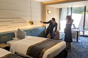 亀の井ホテル淡路島は、2025年8月1日にリニューアルオープンを迎える。淡路島北西部の高台に位置し、播磨灘を望む眺望が魅力だ。既存建築の意匠を受け継ぎながら、淡路の海を旅する“客船”をイメージした空間へ刷新。客室や温泉の改装、淡路島の旬を楽しめる朝食ビュッフェもリニューアルし、ファミリーにも好評だ。