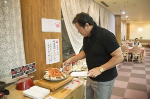 お料理は、夕食・朝食ともホテル自慢の「越後旬菜バイキング」。海の幸・山の幸と越後の味覚を堪能。新米の魚沼産コシヒカリは絶品で、茶碗に2杯も頂きました。